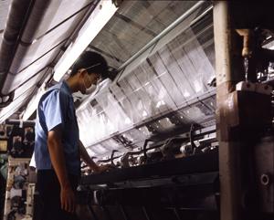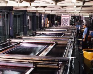 いま毛布の主流といえば、マイヤー毛布です。 2枚の地布を編みながら、同時に毛足となるパイル糸を編み込み、あいだをカットして2枚に分離させ、表裏を逆にして、張り合わせて仕上げます。 この「編む」という技術により、しなやかで毛足の長い、ソフトな感触の毛布になるのです。 染めはシルクの版を何色も重ねる方法で行います。 技術は、着実に進歩しており、ぼかしのはいった繊細な柄もきれいに染まるようになりました。 「特別難しいことはないよ」と、ある染め職人は言いますが、「日本一の毛布のまち」を築き上げたのは、まさに彼ら、泉大津の人たちなのです。