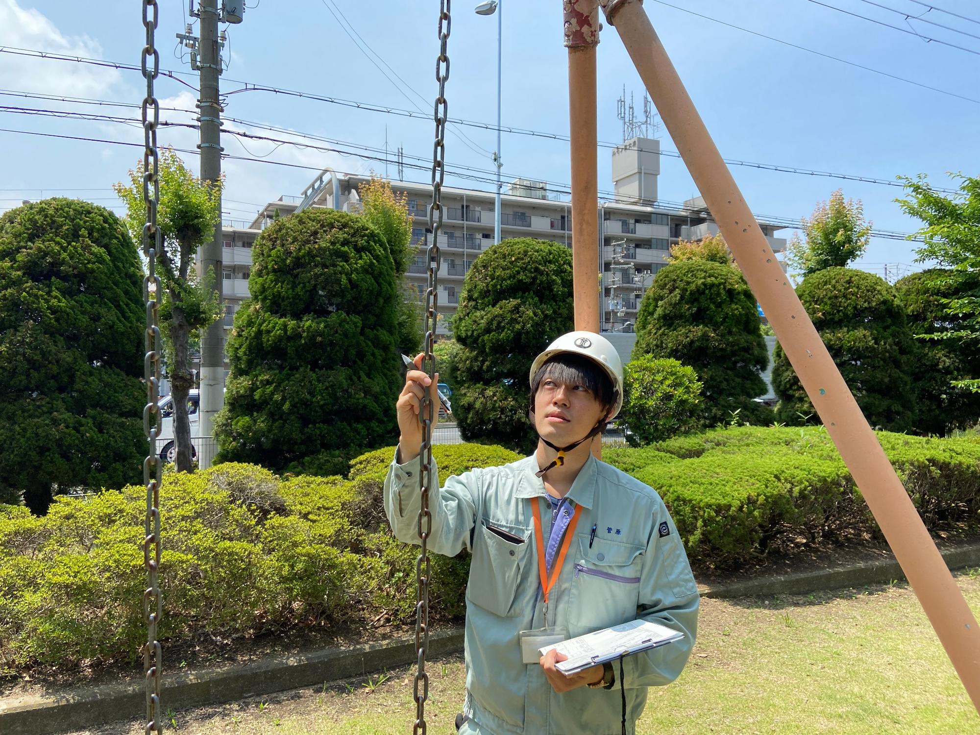 私は現在、都市づくり政策課において、泉大津市の公園やみどり(街路樹など)の維持管理を行う分野でまちづくりに携わっています。主な業務として、公園の維持管理については、市内78箇所にわたる公園の清掃・除草・剪定や、公園の遊具を定期的に点検し修繕等を行っています。街路樹の維持管理についても同様であり、除草や剪定などの維持管理を行い、まちのみどりを守り、景観を良くするといった業務を行っています。