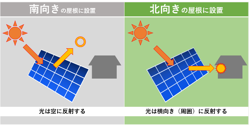 太陽光の角度と、太陽光パネルの角度によって光が反射する方向がきまるので、北向きの屋根に設置を検討する際には特に注意が必要です。北向きでなくても、「北向きに近い」「隣家の窓が高い位置にある」「屋根の傾斜が急」等の場合は注意が必要です。