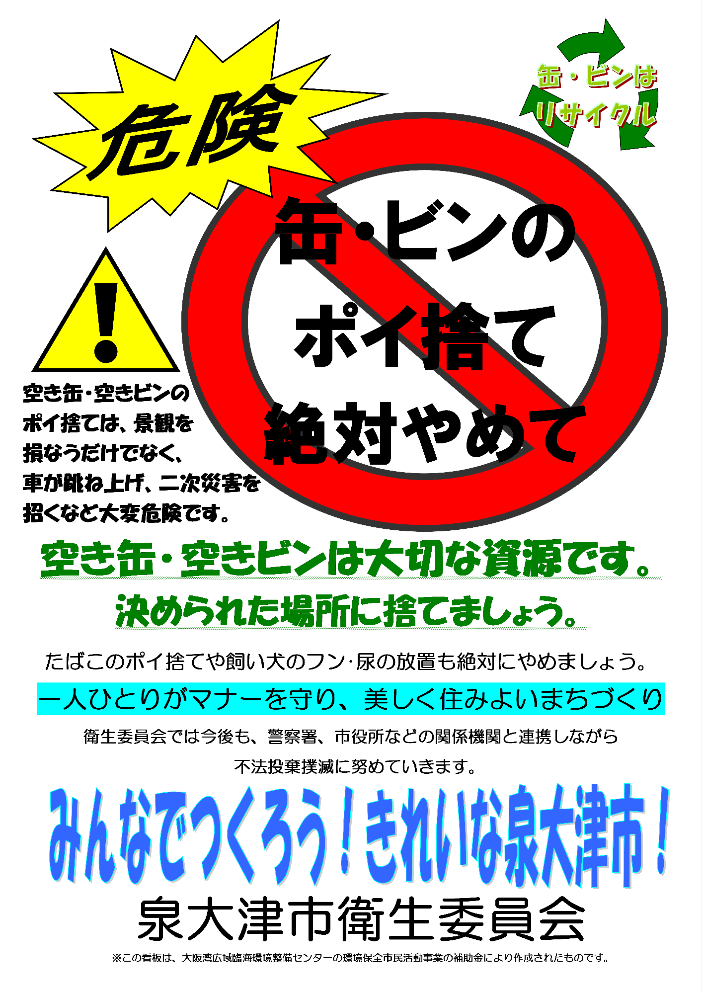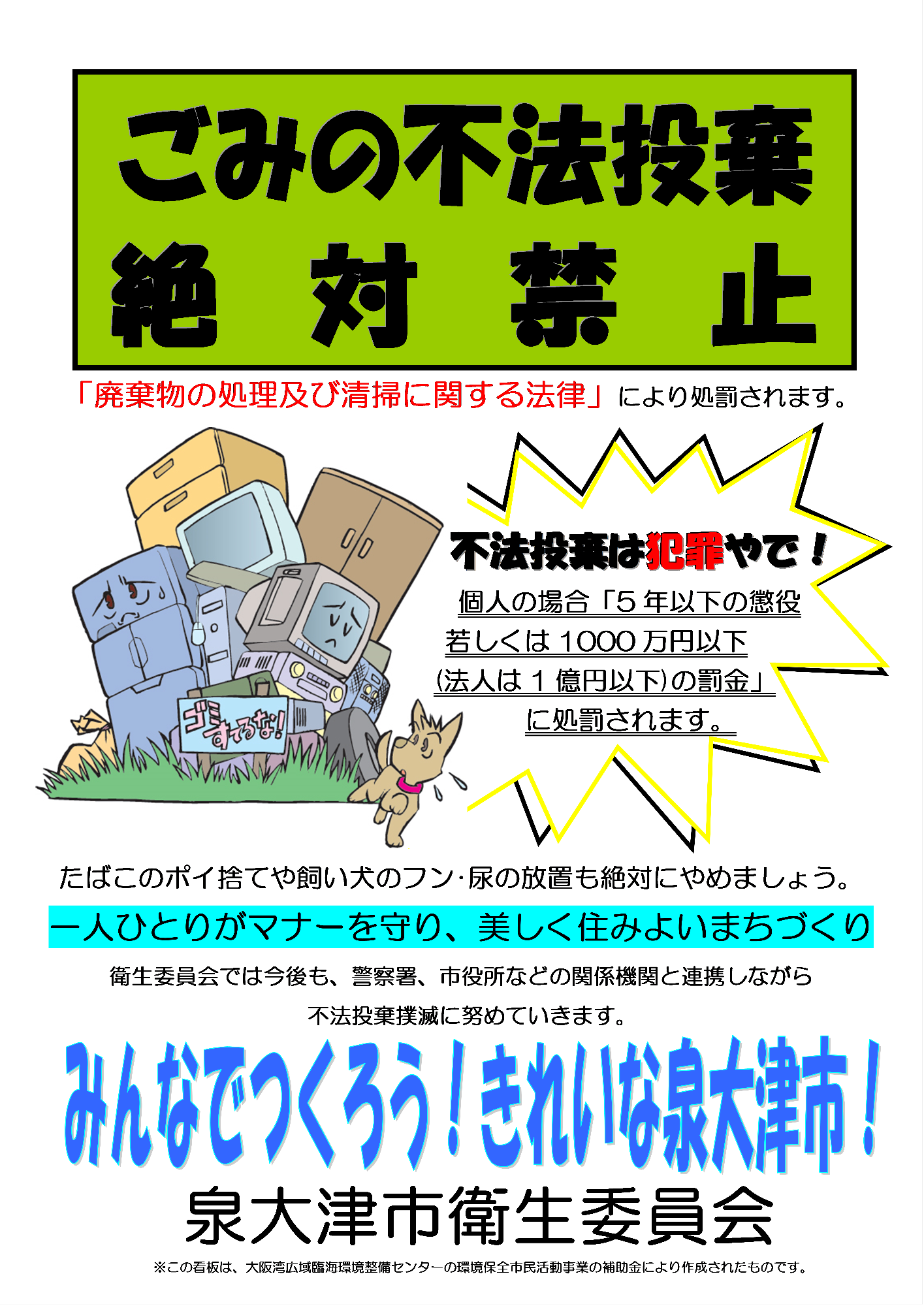 不法投棄禁止等3種類の啓発看板を作製。市内パトロールの際に不法投棄されやすい場所に看板を貼付するとともに、希望する市民に無料配布も行い、不法投棄撲滅を目指す。 |