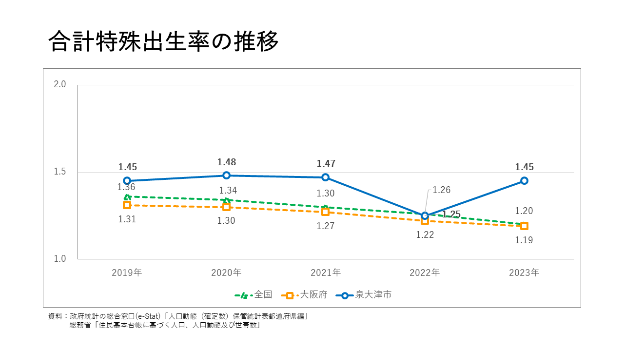合計特殊出生率は、全国・大阪府は減少傾向にありますが、泉大津市は2022年(令和4年)を除き、横ばいで推移しています。