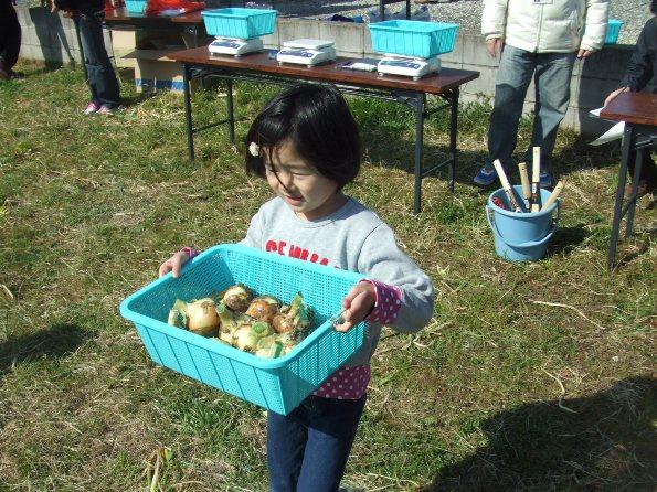 上手に収穫できるかな? イベントでは、期間を通して草抜きなど畑の手入れを頑張った方へ『毎日がんばったで賞』や、収穫した作物の重さを量って決める『ジャンボたまねぎ賞』などが選ばれました。