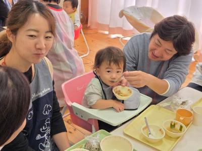 今日の給食はパパ、ママに食べさせてもらえてご機嫌です♪