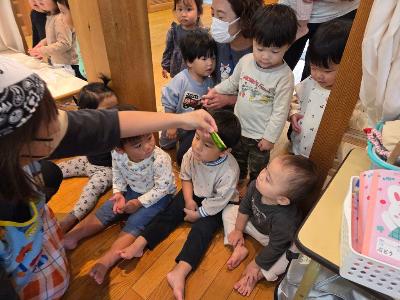 0・1歳児さんは、お兄さんやお姉さんがクッキングする様子を見たり、野菜のにおいを嗅いだりして、興味津々な様子でした。