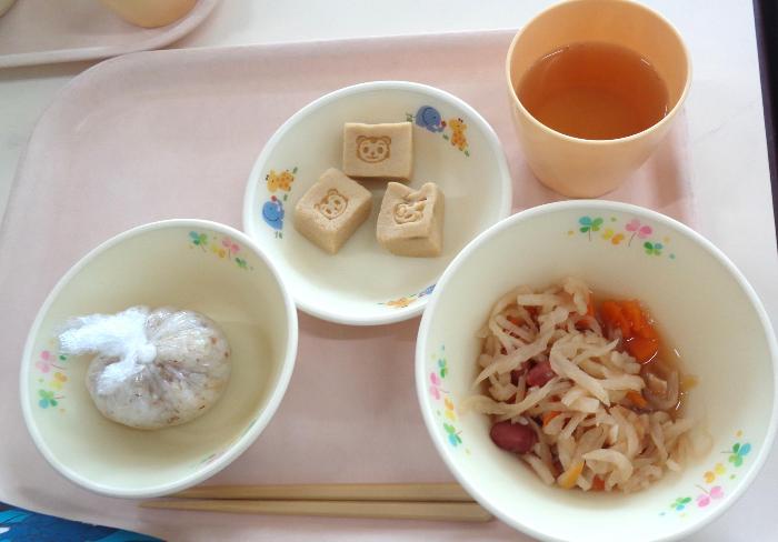 献立:手作りふりかけおにぎり、高野豆腐の煮物、金時豆と切り干し大根の煮物