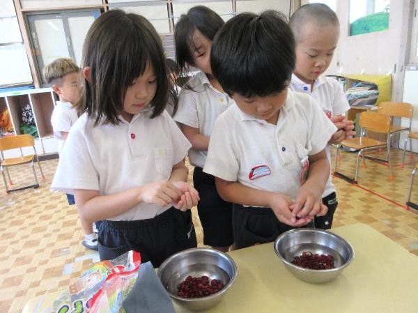 クッキング前日に金時豆を水に漬けるこどもたち。次の日どうなってるか楽しみだね。