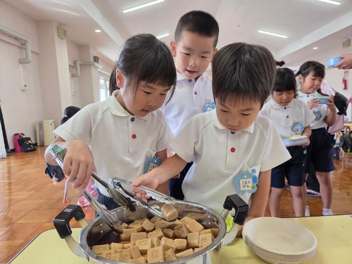 盛り付ける時には、高野豆腐一つひとつにしまじろうとその仲間たちの焼印が押してあるため、「どの高野豆腐にしようかな~」と、真剣な表情で悩む子どもたちでした。