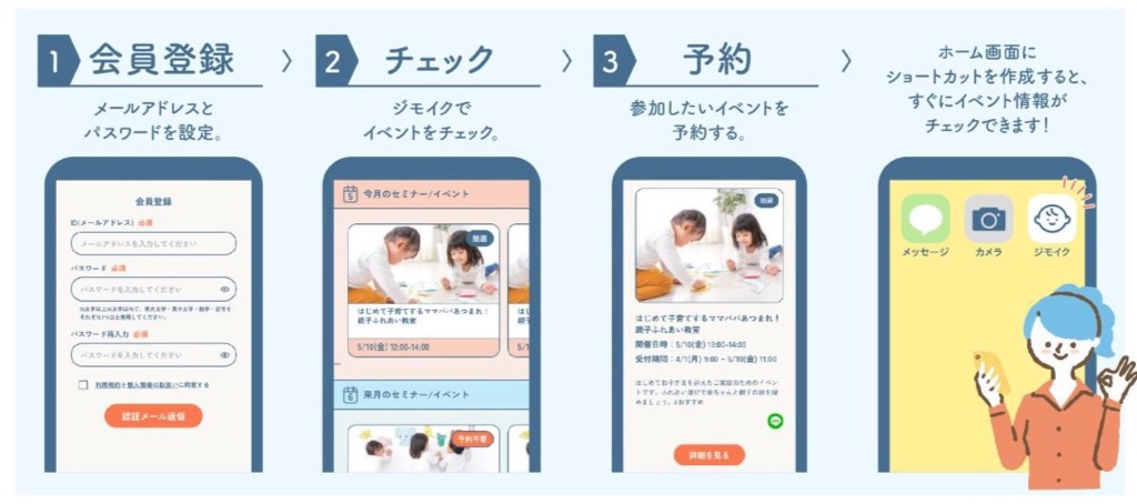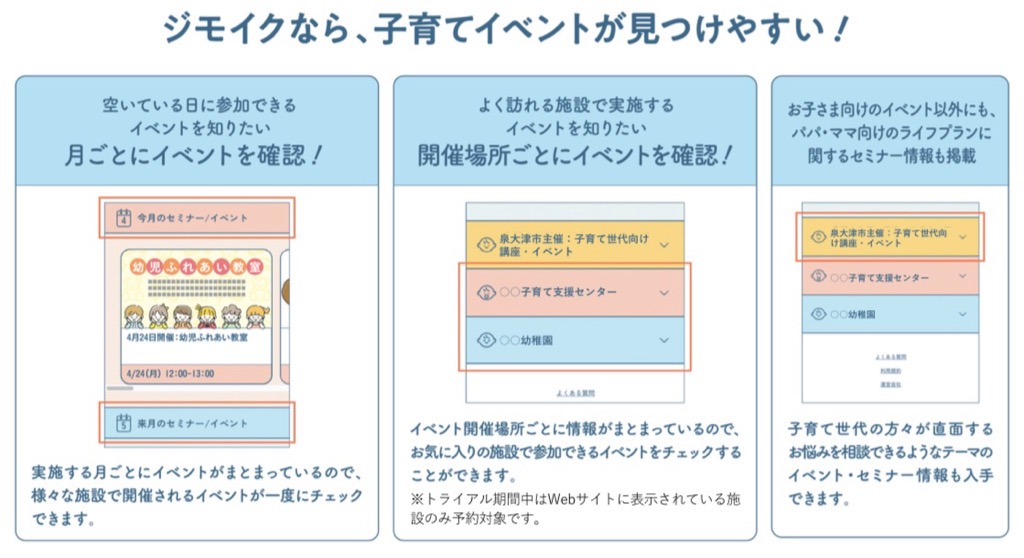 ジモイク泉大津は、子育て講座やイベントをWeb上で確認・予約できる子育て世帯向けの『Web予約サービス』です。