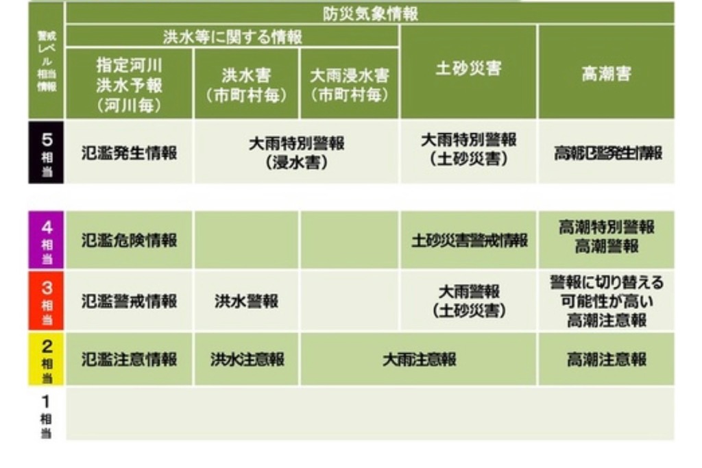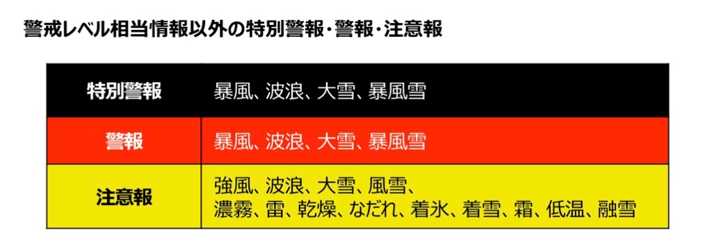 警戒レベル相当情報(河川氾濫、大雨、土砂災害、高潮)以外の特別警報・警報・注意報はこれまでと変わりません