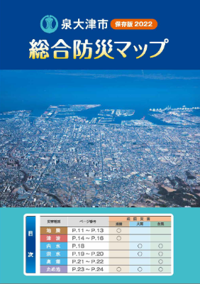 泉大津市総合防災マップは、最新の解析をもとにした津波や洪水ハザードマップ等と、事前に備えておくべきもの・決めておくべきことに関する内容などが掲載されています。