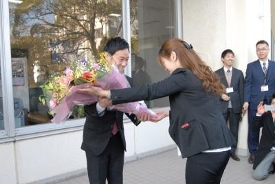 午前9時30分、市役所に登庁した南出市長は盛大な拍手に迎えられ、庁舎の玄関先で女性職員らから笑顔で花束を受け取った後、「大変、身の引き締まる思い。『一人の百歩ではなく、百人の一歩』76,000人市民総出で、元気な泉大津を作っていきたい。そのためにも職員の皆さんと信頼関係を築き、アイデアを出していただき、みんなで一歩踏み出したくなる市政を市民、議会、職員とともに一丸となって作っていきたい」と挨拶した。