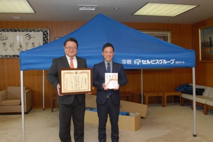 泉大津市(南出賢一市長・人口約75,000人)は、31日、災害時における応援協定先である株式会社セルビス(泉大津メモリアルホール)(代表:坂元正幸、本社:堺市)よりイージーアップテント2基の寄贈を受けた。