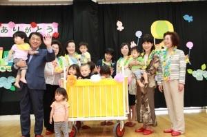 かみじょう認定こども園で贈呈式があり、園児たちからの歌の披露をはじめ、手遊びなどを一緒に楽しむなど、和やかな雰囲気で、子どもたちと交流しました。