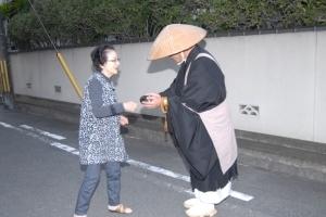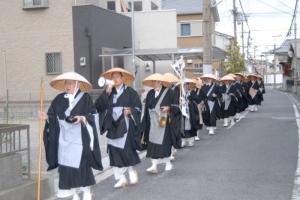 この日市内12か寺の僧侶たちが、黒い衣に袈裟を着け、編み笠をかぶり、右手に錫杖(しゃくじょう)左手には鉄鉢(てっぱつ)をもち、念仏を唱えながら行脚し、市民に善意を呼びかけると、近くのお年寄りや主婦らが喜捨(きしゃ)を差し出していた。