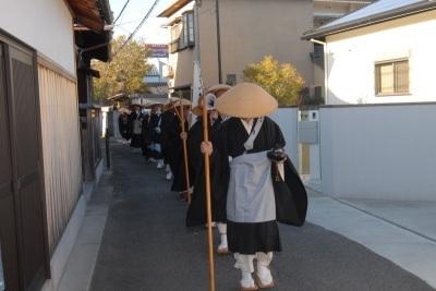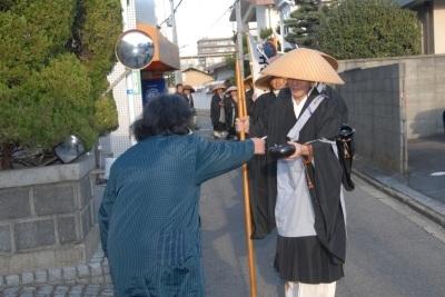 歳末に入り各地で歳末助け合い運動が行われている中、泉大津市の浄土宗寺院(12か寺)でも、この運動に協力しようと12月14日の午後3時から午後7時まで、穴師地区で托鉢が行われた。