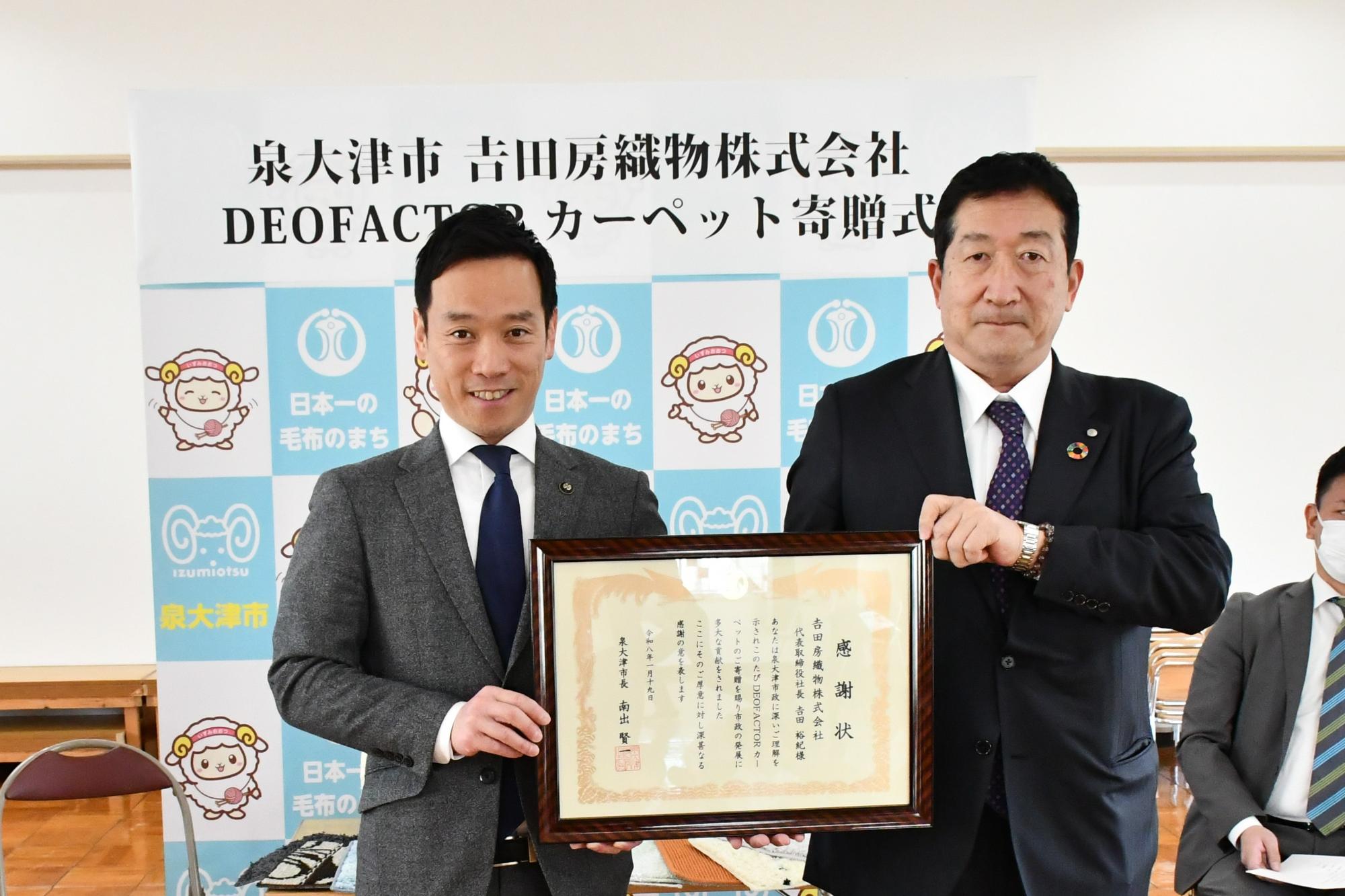 大阪府泉大津市(市長:南出賢一)は、地元繊維企業である𠮷田房織物株式会社(泉大津市、代表取締役社長:𠮷田裕紀、以下「𠮷田房織物」)から、高機能なDEOFACTOR(デオファクター)カーペットの寄贈を受け、市立旭幼稚園において寄贈式を開催しました。