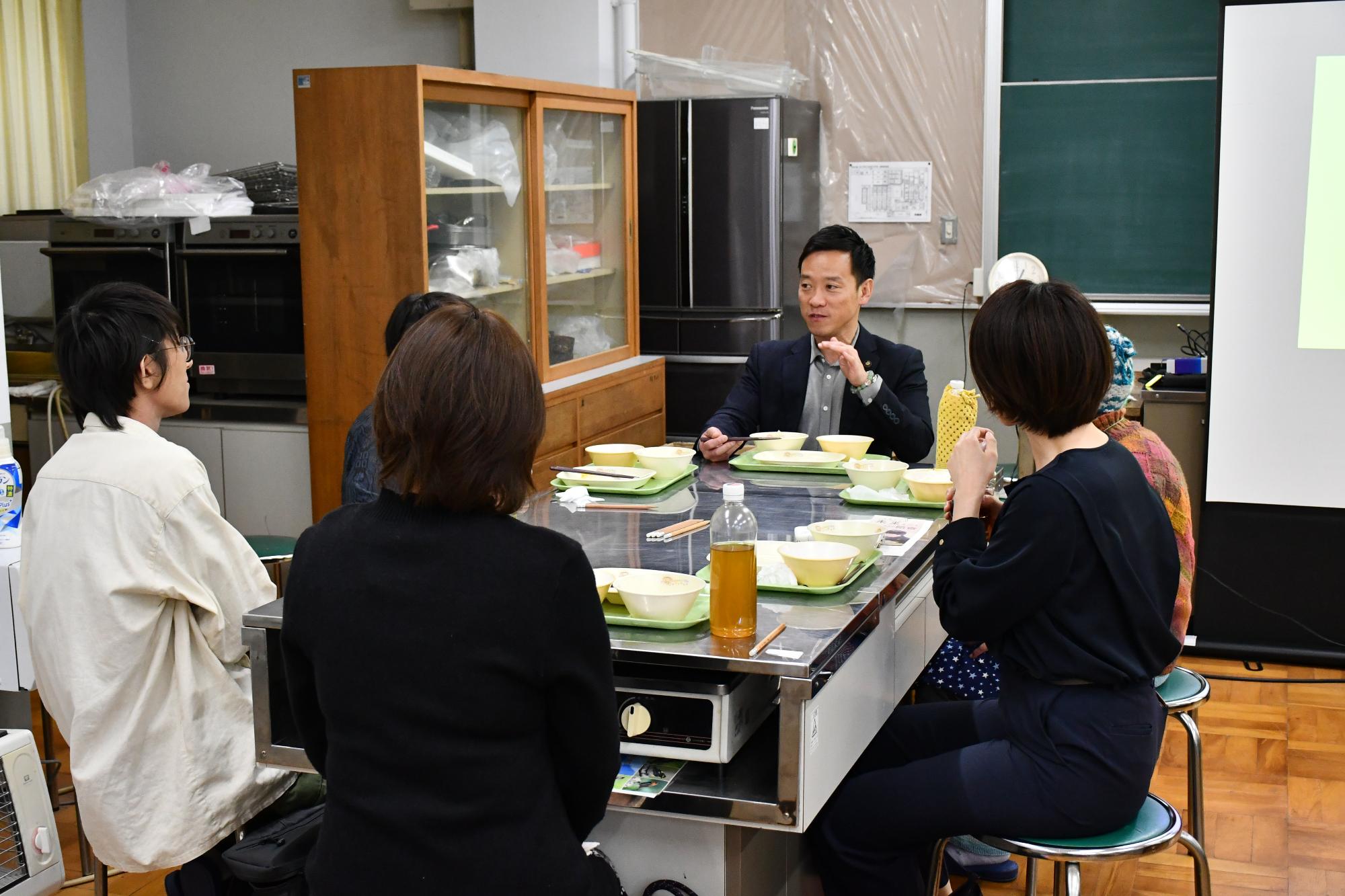 新しくなった教育支援センターで、市長から市の施策を説明した後、金芽米の試食をし、市長と座談会形式で意見交換を行う「市長と語ろう!いずみおおつ“未来”トーク」を開催しました。