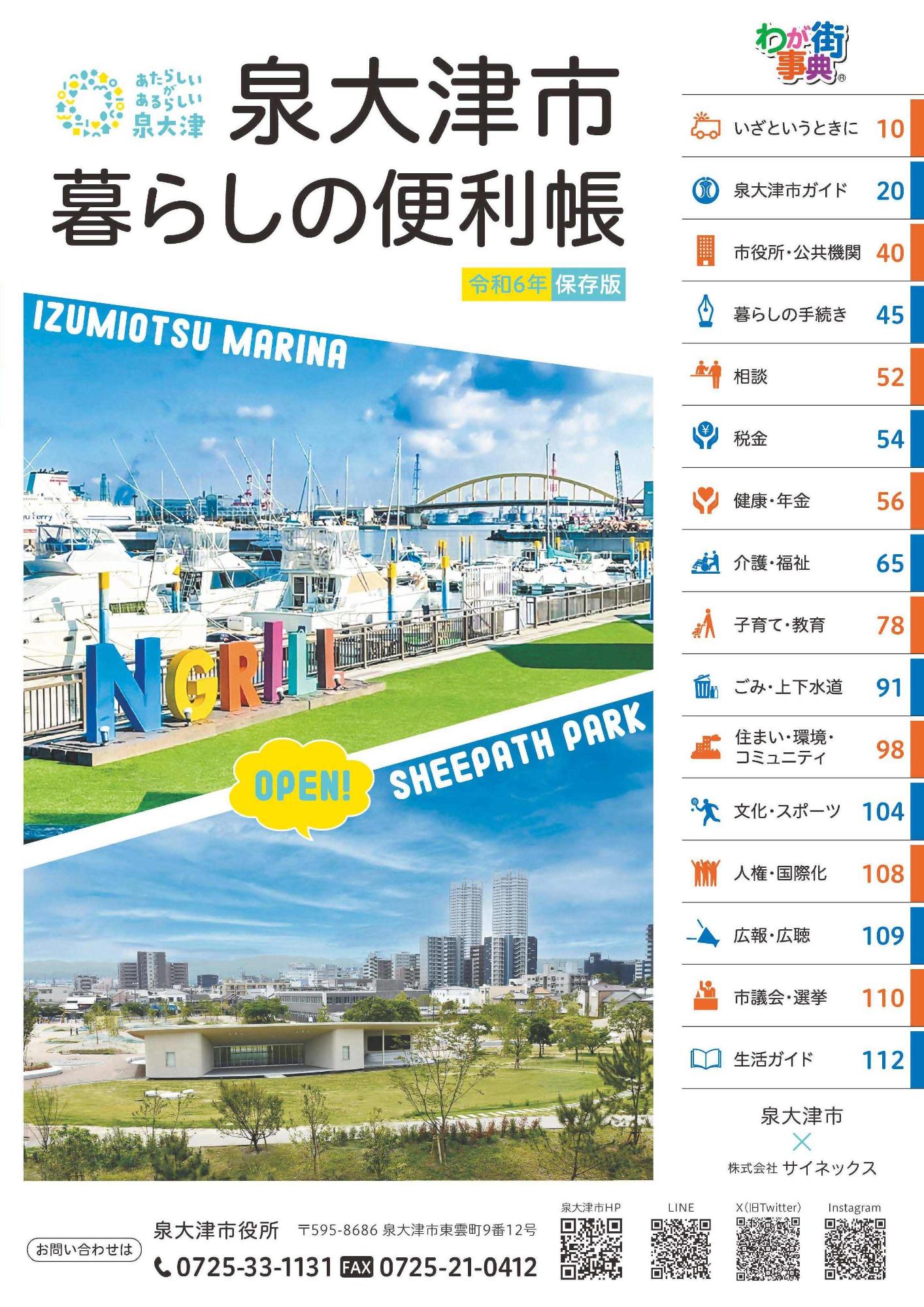 「令和6年版泉大津市暮らしの便利帳」を発行しました 更新日:2024年08月01日 令和6年8月に本市の概要や業務、市内医療機関などの情報を1冊にまとめた「令和6年版泉大津市暮らしの便利帳」を官民協働で発行しました。 発行に伴い、令和6年8月中に市内の各世帯へ配布するとともに、パソコンなどからも閲覧ができるよう「泉大津市暮らしの便利帳」を電子書籍版の配信を開始しました。 ※利用料金は無料です。ただし、通信料は利用者の負担となります。 ※電子書籍の掲載内容は令和6年7月現在の情報です。 ▼下の画像をクリックすると、電子書籍版「泉大津市暮らしの便利帳」を閲覧することができます(外部リンク) 対応端末 ・パソコン ・iPhone ・iPad ・Android搭載スマートフォン この記事に関するお問い合わせ先 秘書広報課 みなさまのご意見をお聞かせください このページの内容は分かりやすかったですか 分かりやすかったふつう分かりにくかった このページは見つけやすかったですか 見つけやすかったふつう見つけにくかった このページに関してのご意見がありましたらご記入ください。 当フォームは、返信不可能のため、ご質問にはお答えすることができません。