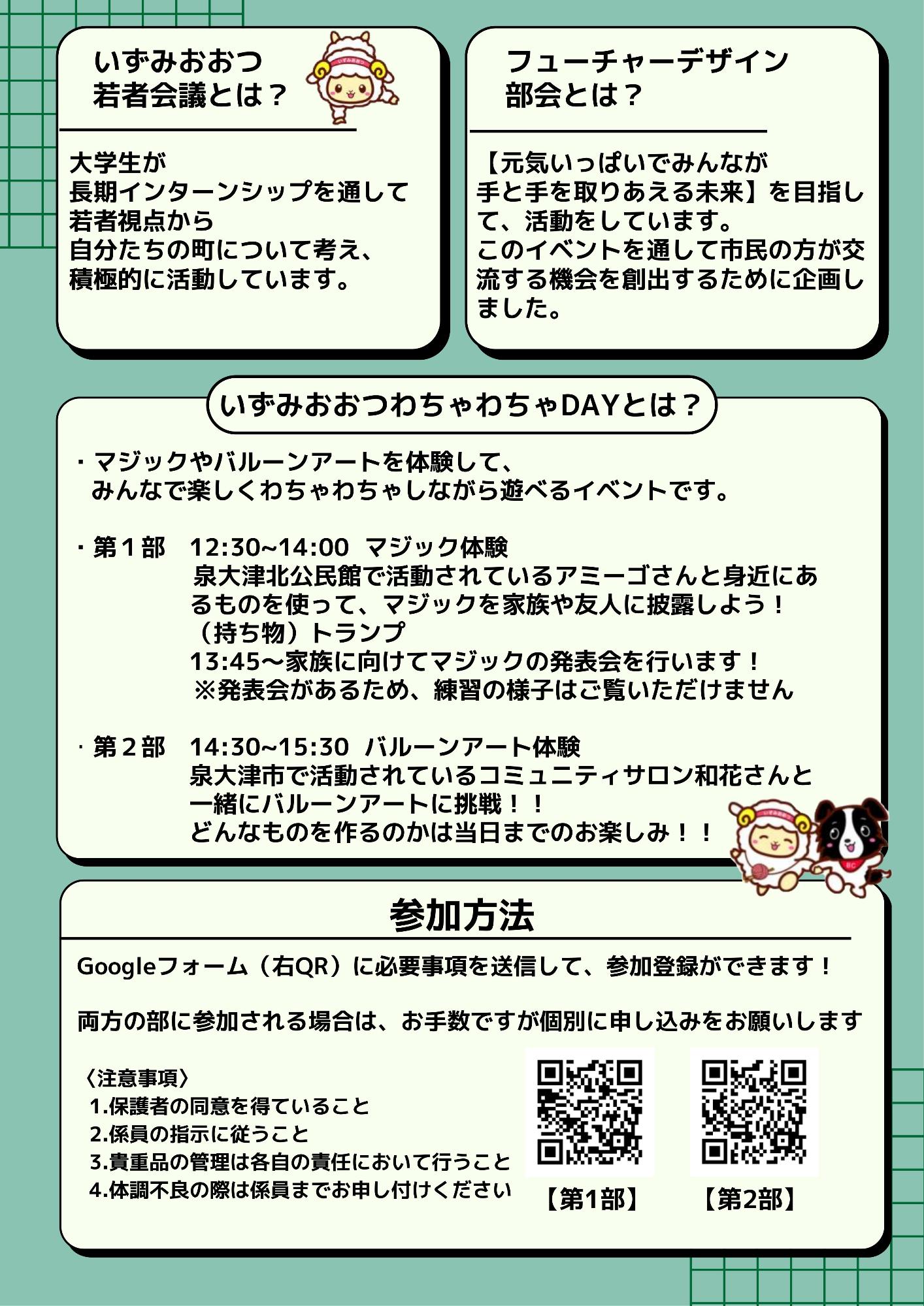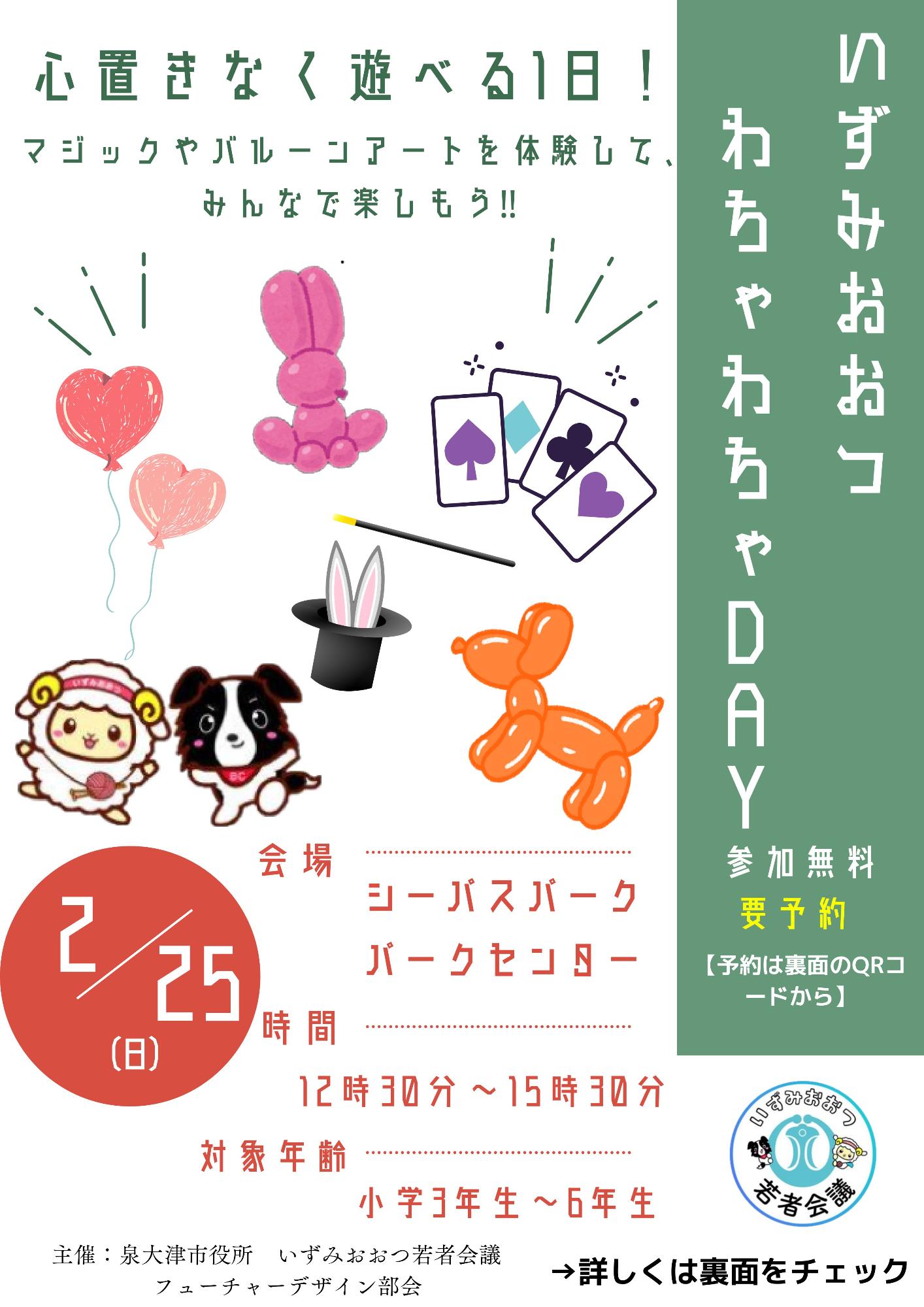 「わちゃわちゃな未来」への実現の第一歩として、令和6年2月25日(日曜日)にシーパスパークで小学3~6年生を対象としたいずみおおつわちゃわちゃDAYを実施しました。このイベントは子供たちの学び、地域コミュニケーション機会の創出と子供だけで安心安全に遊べる場所をつくることを目的に開催しました。