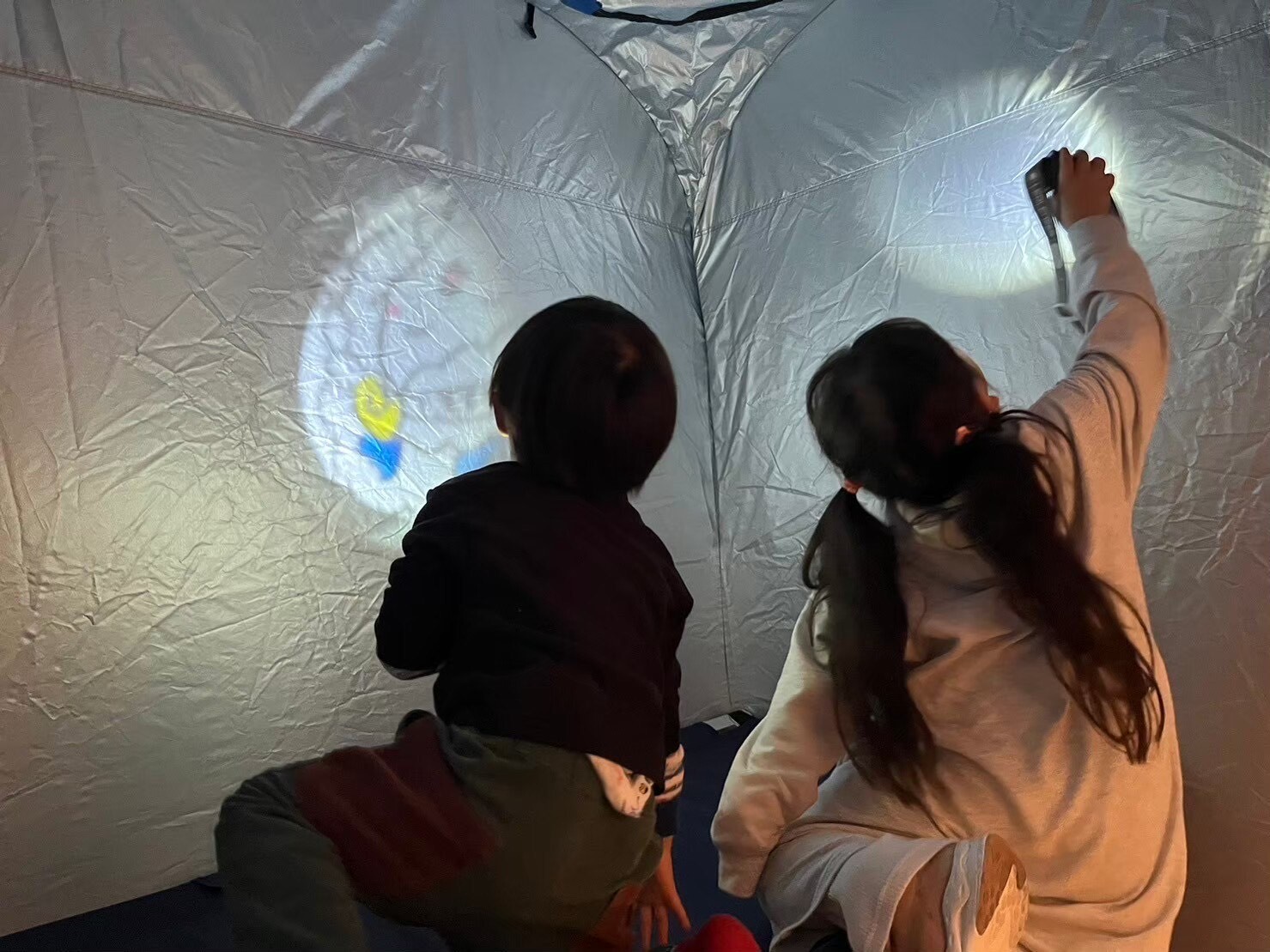 会場には、どこの避難所でも手に入りやすいダンボールや食品用ラップで作った、「段ボールトンネル」と「影絵遊び」を用意。子どもたちは夢中になって楽しんでいました。工夫次第で、避難所でも遊び場を作ることは可能だと実感しました。