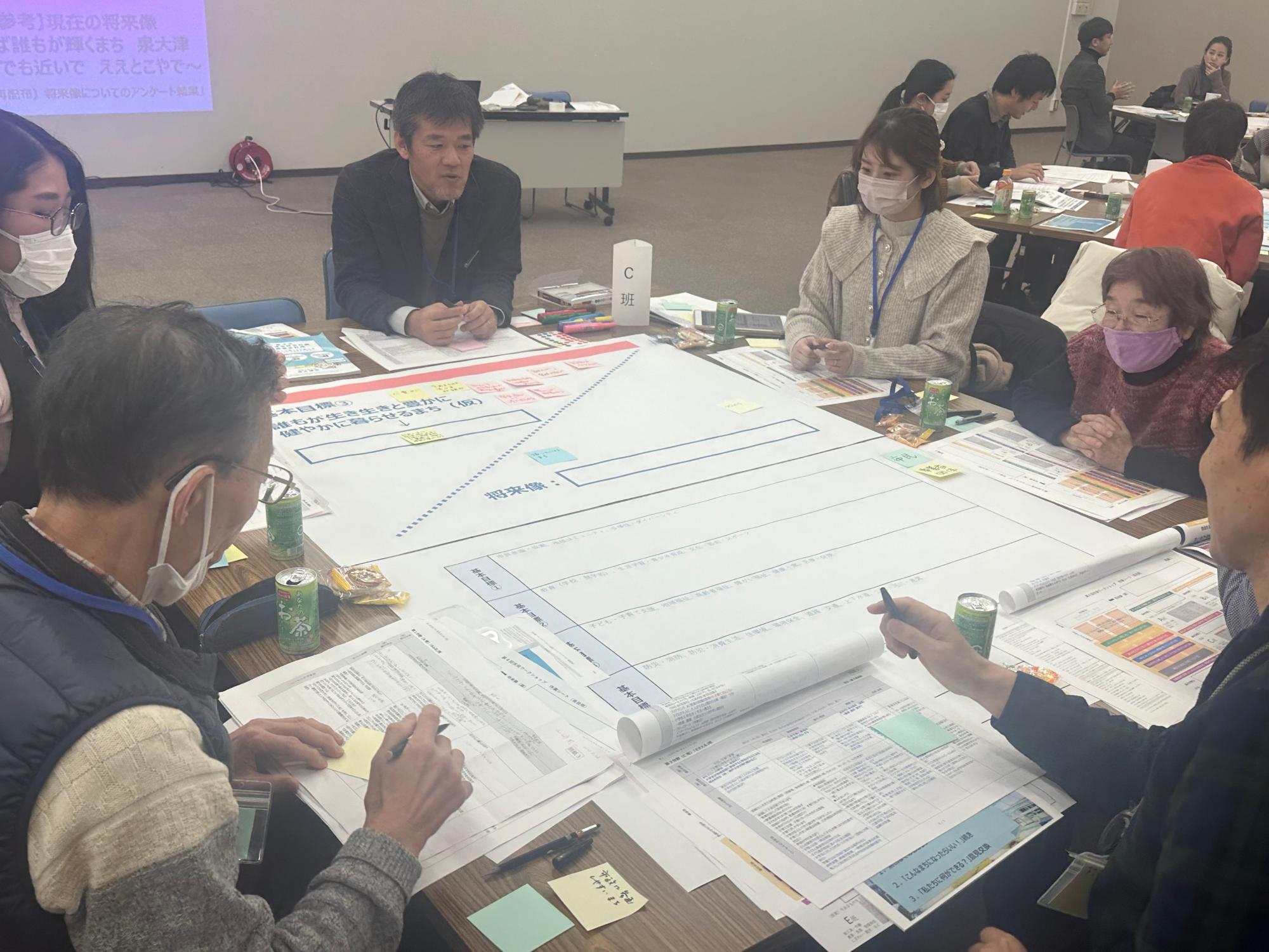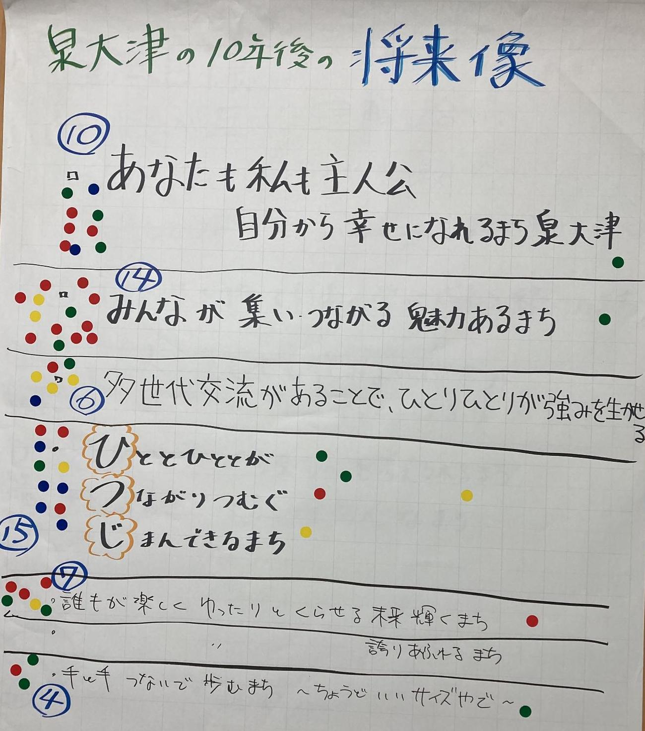 前回の意見交換内容を共有し、市の現状を踏まえて、将来「泉大津がどんなまちになったら良いと思うか」「どんなまちを目指したいか」について年齢別で班に分かれて意見交換しました。理想像をジャンルによって分け、特に重要だと思うものは何かを検討しました。