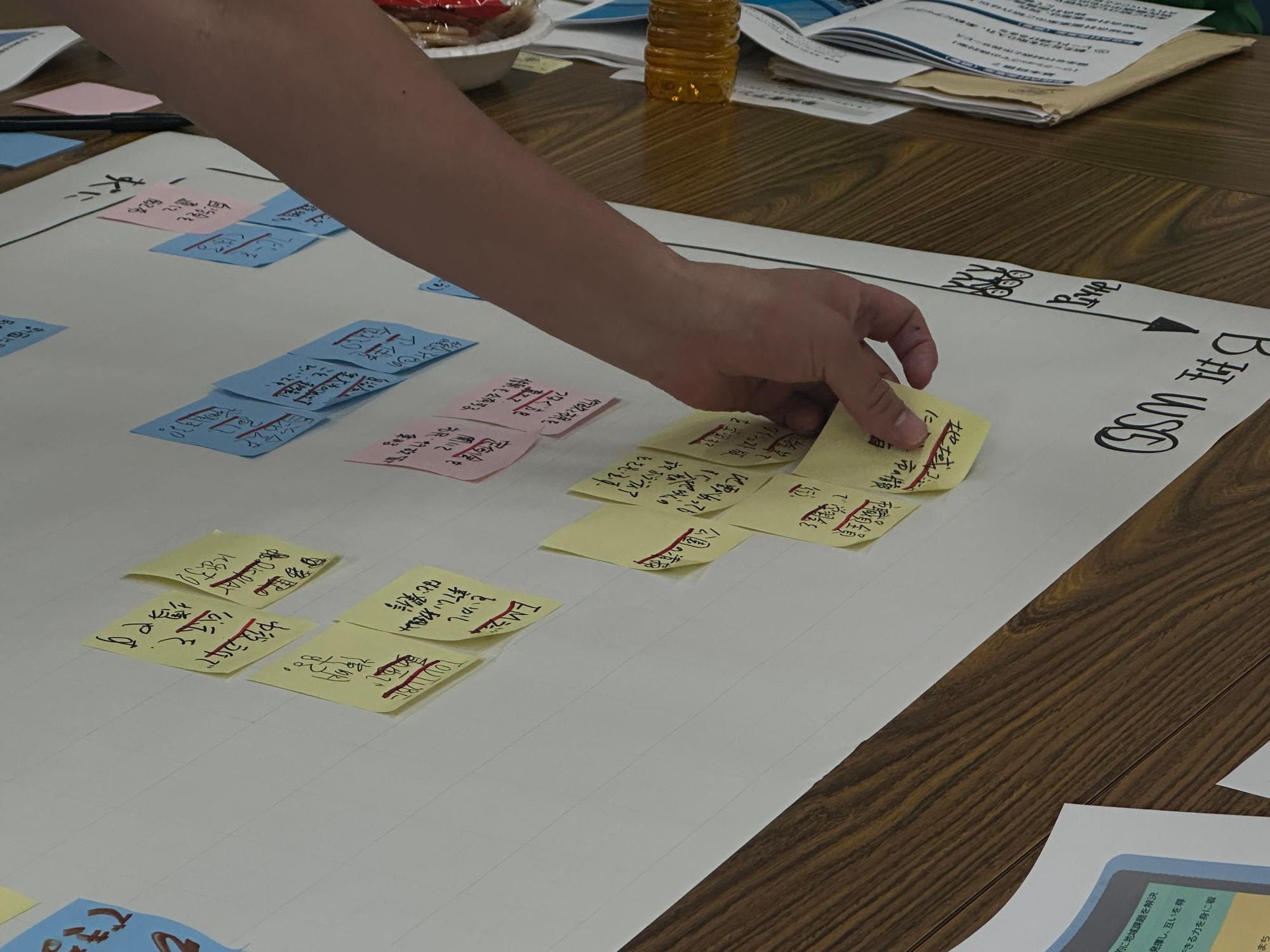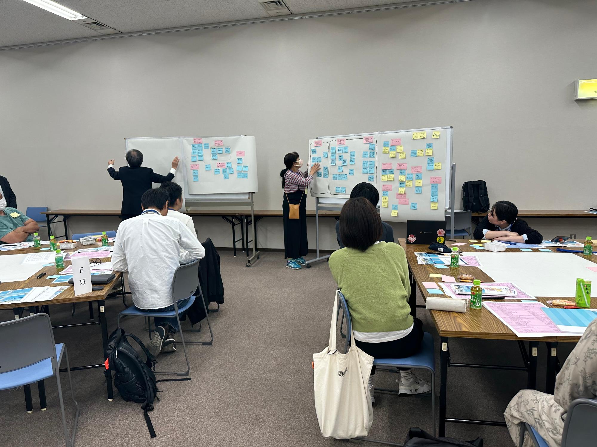 前回の意見交換内容をおおよそのテーマに分けたものを共有し、理解を深めました。将来「泉大津がどんなまちになったら良いと思うか」「どんなまちを目指したいか」について、テーマ別の希望制で班に分かれて、最終的な意見出しを行いました。出された意見から、重視する視点や共通するキーワードを抽出し、ジャンルごとの個別目標と、個別目標を全体的に捉えた基本目標に関しての案を考えました。