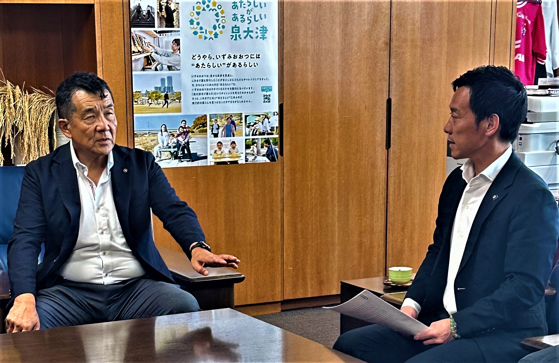 審議会を代表して臼谷会長から市長へ、泉大津市総合計画(案)に対する答申書が手渡されました。その後、同席された委員と共に審議会での様子やまちづくりについて意見交換を行いました。