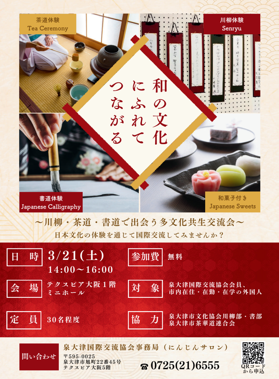 泉大津国際交流協会では会員や地域の外国人を対象に、川柳・茶道・書道などを体験できるイベントを開催します!日本文化を通じて、楽しく多文化交流してみませんか。