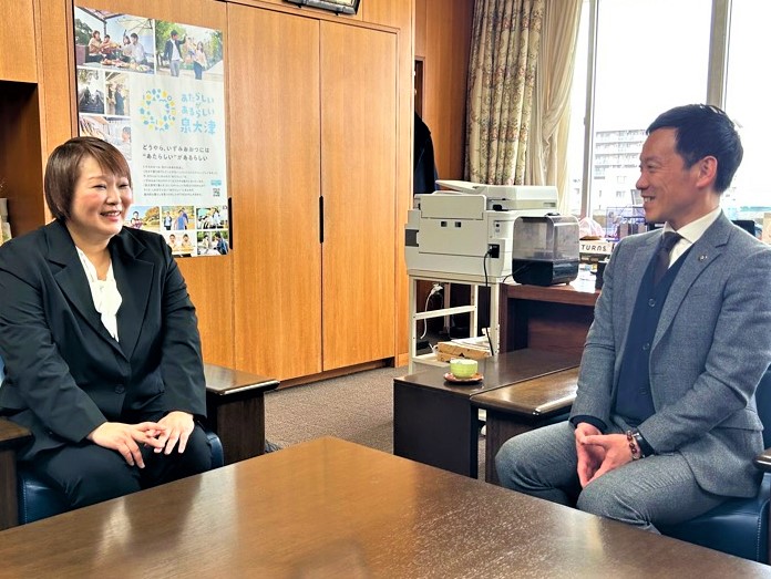 五十嵐氏は、芸歴30年の振り返りと今後の抱負について、泉大津市に対する思いなどをお話され、南出市長からは、泉大津市出身の方の活躍を嬉しく思っており今後の活躍にも期待していること、大使活動に関する感謝を述べました。今後の連携についても前向きな意見交換ができました。