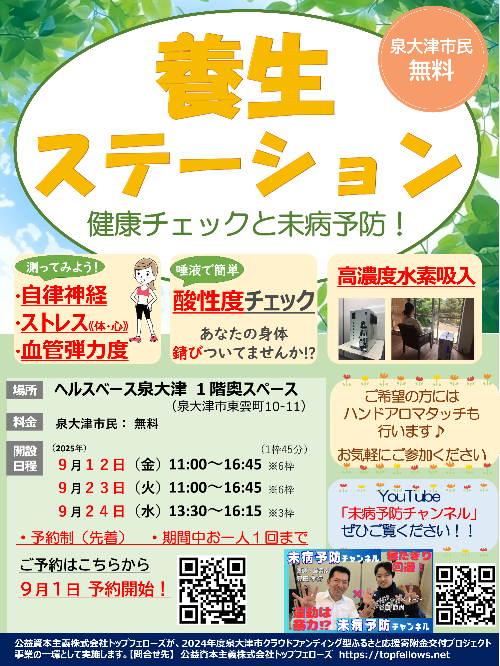 未病予防のために、市民が日常的に自らの身体をチェックし、心身を整えることができる場所として、根本的な健康づくり(=養生)の実践を助ける「養生ステーション」が開設されます。