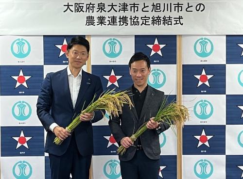 『旭川市では、農家戸数の減少や高齢化・コロナウィルス感染症の影響で農作物の消費が減少するなど、農業を取り巻く環境が苦しい状況である。一方で、そのような状況でも、夢と希望を持ち未来に向かって営農を続けている方もいる。地域の農業の活性化を図ることが、本市経済の底上げに繋がるため、スマート農業の進行・大規模化・販路拡大など、様々な施策を実施しているところである。今回、泉大津市から旭川市の農政の課題解決につながる貴重な提案をいただき連携に至った。旭川市産の有機JAS米20トンを小中学校や就学前の給食で使用されることを本当に嬉しく思う。持続可能な農業を続けていくために、供給先が確保され、営農意識が高まることを期待している。また、地域のみならず、日本の農業を盛り上げていくため、生産地と消費地を結びつける取組みに旭川市としても貢献していきたいと考えている。』