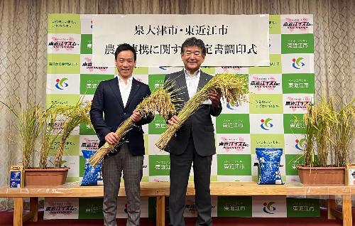 泉大津市では、「市民の健康増進」及び「食料危機への備え」の観点から、日本人の主食であり、栄養価やカロリー貢献度が高い米(食糧)を国内の農業の持続的発展に寄与する形で安定的に確保していくため、令和5年3月に「安全・安心な食糧の安定的確保に関する構想」を策定。今年度、本構想の実現に向けた農業連携先となる自治体を募集し、東近江市との協定締結に至りました。
