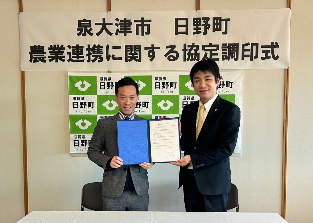 『近年のお米の価格高騰をはじめ、日本を取り巻く食料を巡る状況は大きく変化しており、将来に向けた食の安定確保が重要な課題となっています。泉大津市のような農地を持たない消費地では、不測の事態に備えた食糧確保が課題である一方、生産地では、「農業従事者の高齢化」や「担い手不足」など深刻な課題を抱えています。今回の連携により、独自の「食のサプライチェーン」を構築し、双方の課題を補完し合うことで、「共存共生の関係性」を築いていきたいと考えています。日野町様は、これまでも消費者とのつながりづくりに積極的に取り組まれてきました。本市としても消費地の立場から、行政のみならず住民同士の交流を通じて、「顔の見える関係性」を築くことで、その絆が「子々孫々」にわたり継承されることを期待しています。』