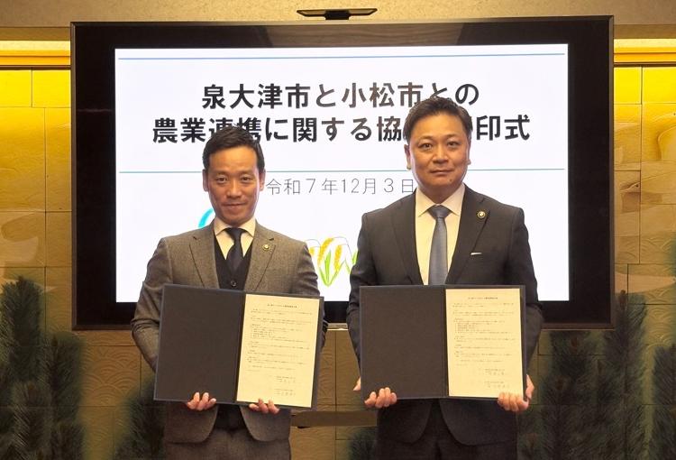 その中で、安全で安心な「食」を安定的に確保するためには、持続可能な農業の実現と、その農業を支える「環境」への配慮が必要不可欠である。今回、エコ農業や環境保全を推進する小松市様と連携協定を締結できたことを大変嬉しく思う。農業連携をきっかけに、将来的には地域交流など連携分野を展開し、環境保全型農業の理解促進や泉大津市民の食育推進にも繋げ、子々孫々まで共存共生の関係性を構築していきたい。』