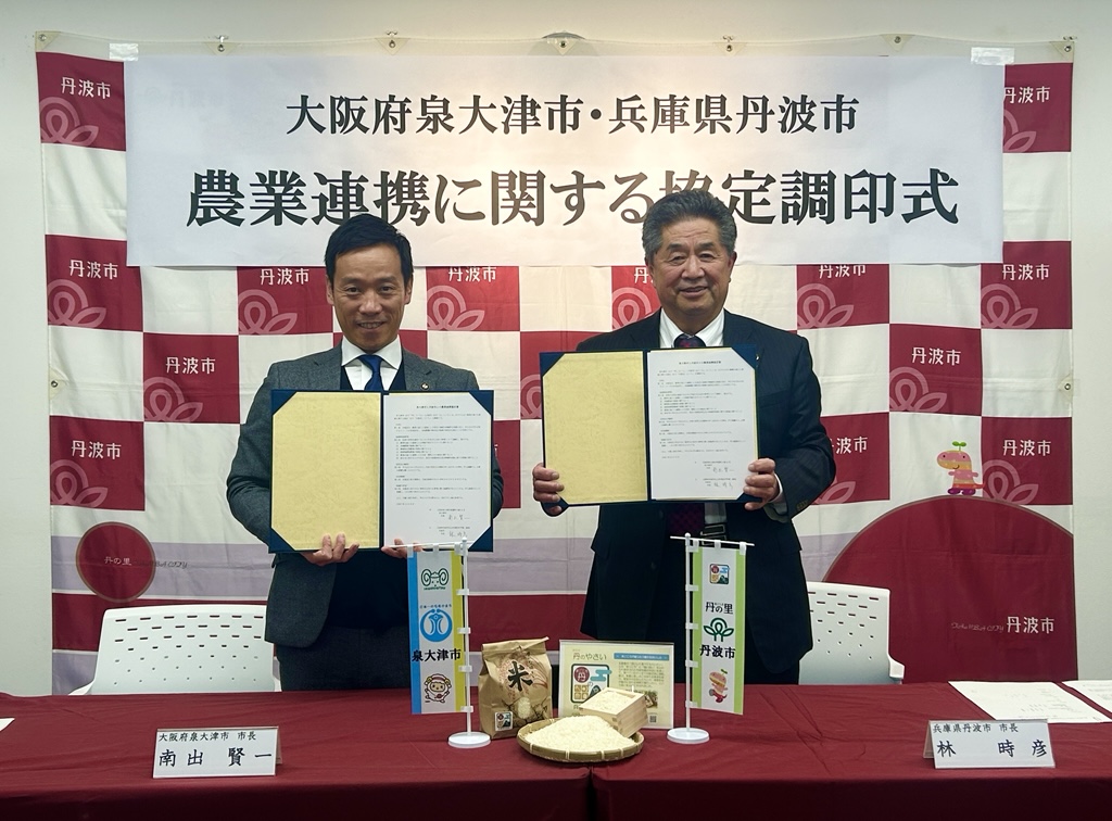 『本市では、生産地と消費地が連携し、環境に配慮した農業をともに推進する取組みを進めており、令和6年に全国初となる「生産地」と「消費地」の2者間でのオーガニックビレッジ宣言を行いました。また、「医食同源・身土不二」の考え方のもと、学校給食での有機JAS認証米や特別栽培米の活用など、消費地の立場から有機農業を支える取組みを進める中で、約50年にわたり有機農業を実践されてきた丹波市様と連携できることを大変心強く感じています。近年、「有機(オーガニック)」への関心が高っていますが、日本の有機農業は世界的に見るとまだ発展途上にあります。丹波市様と泉大津市が、有機農業を通じて、「生産地と消費地が支え合う共存共生の関係性」を体現するモデルケースとなり、有機農業の魅力と可能性を全国に発信していきたいと考えています。』