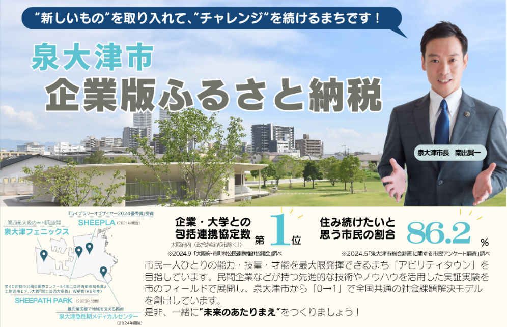 泉大津市では、企業版ふるさと納税の制度を活用し、「第2期泉大津市まち・ひと・しごと創生推進計画」の取組みにご寄附いただける企業を募集しています。