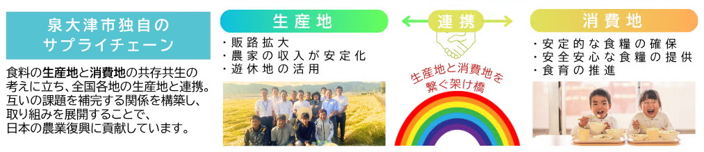 泉大津市では、2023年3月に「安全・安心な食糧の安定的確保に関する構想」を策定。「安全・安心な食」と「健康」の2つを掛け合わせた政策として、全国各地の農産物の生産地と連携し、就学前施設・市内小中学校の給食をはじめとした「子育て世代への食糧支援」等を実施します。