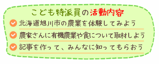 農業連携先である北海道旭川市へ行き、普段できない体験や取材を通して、有機農業や食等の魅力を発信する「こども特派員」に挑戦してみませんか?