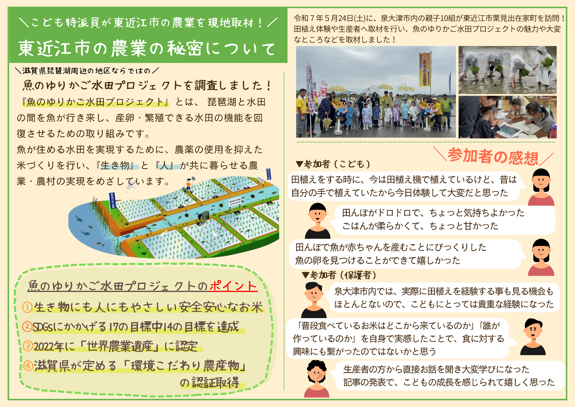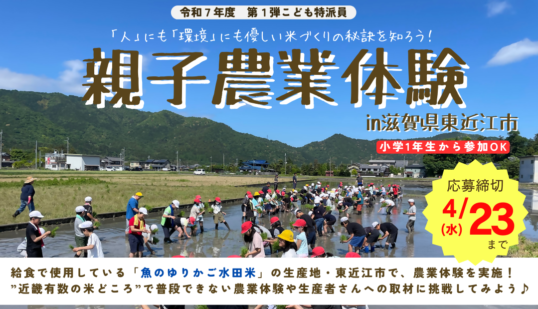 東近江市ならではの米作りや田植え体験など、普段できない農業体験や生産者への取材と通して、「農業」や「食」の魅力を発信する「こども特派員」に親子で参加しませんか?