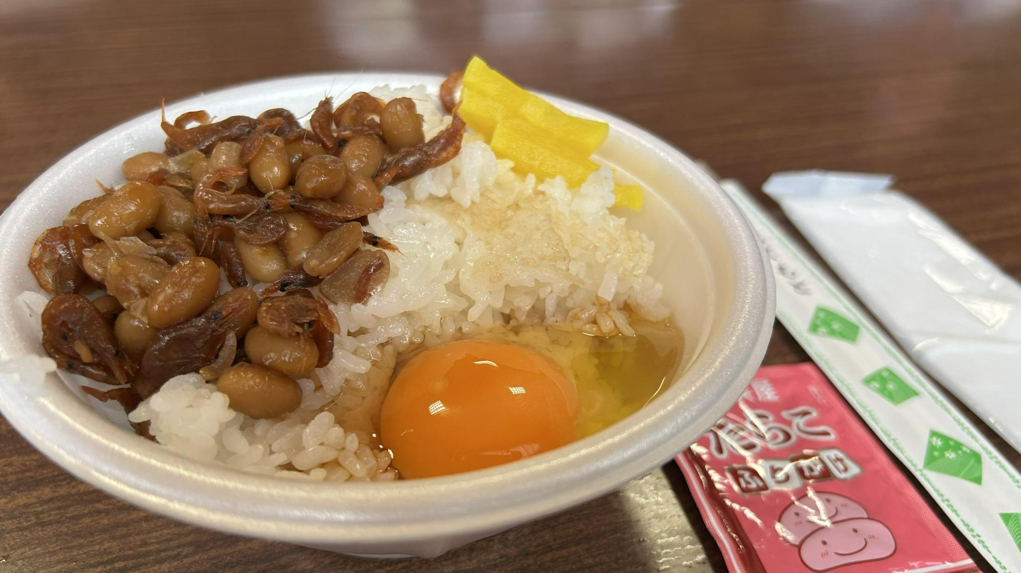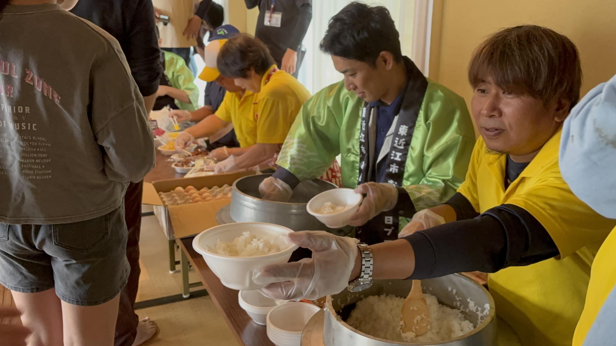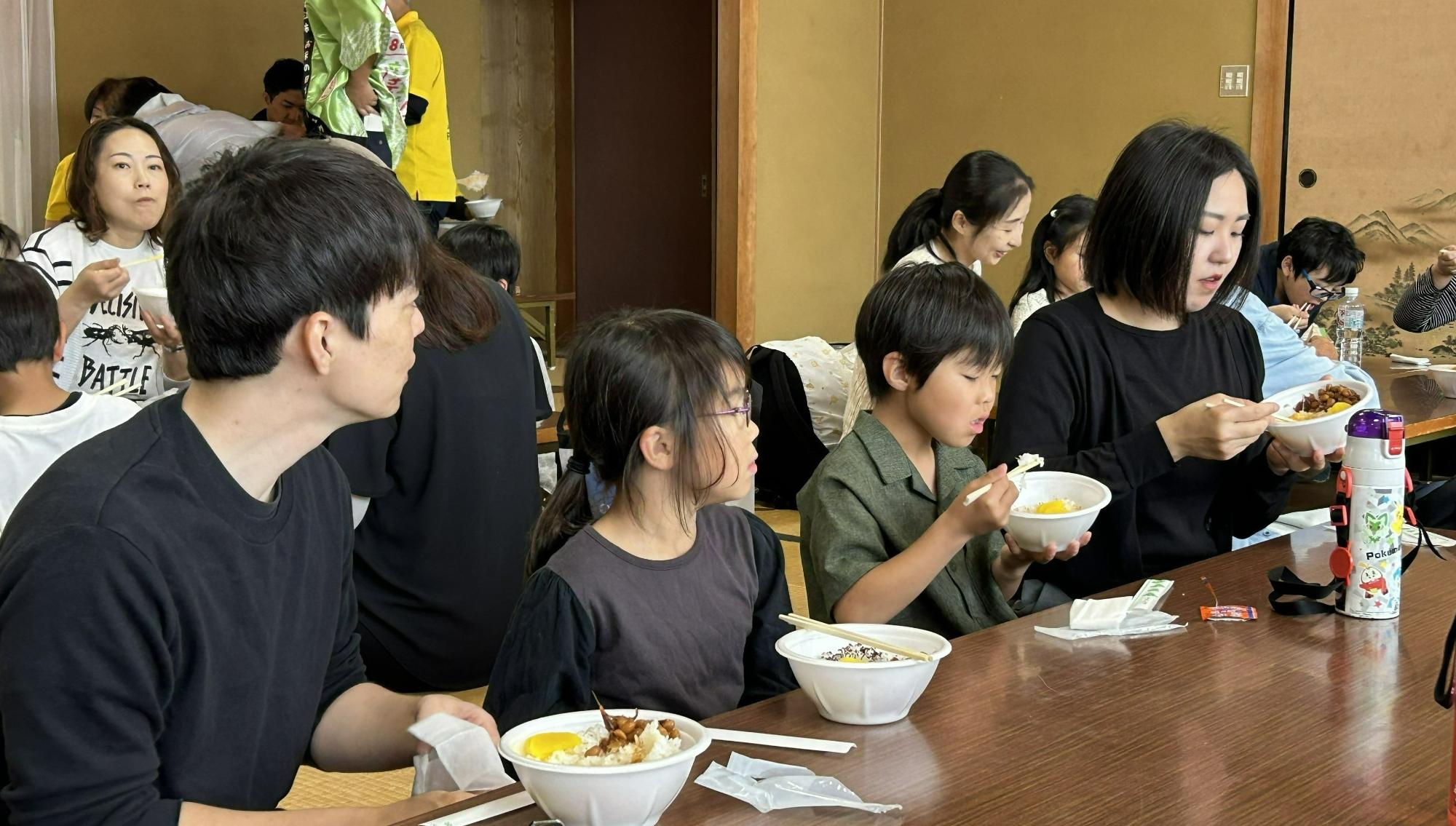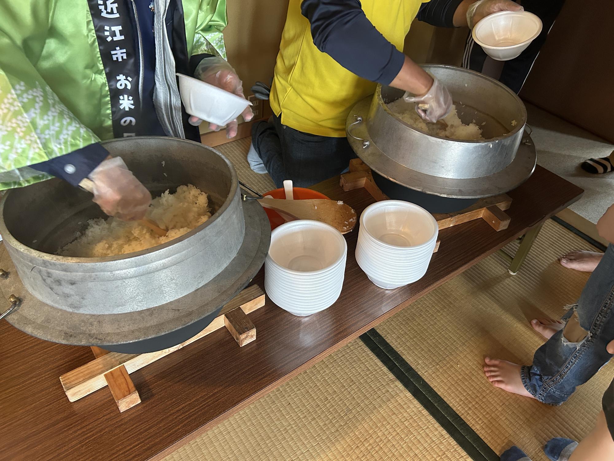 昼食では、大きな釜で炊いた「魚のゆりかご水田米」と、滋賀県の郷土料理である「えび豆(琵琶湖で獲れたスジエビと大豆を甘辛く煮たもの)」などをいただきました。田植え体験を終えてお腹が空いていたこともあり、ごはんやおかずを何度もおかわりするこどもたちの姿が印象的でした。