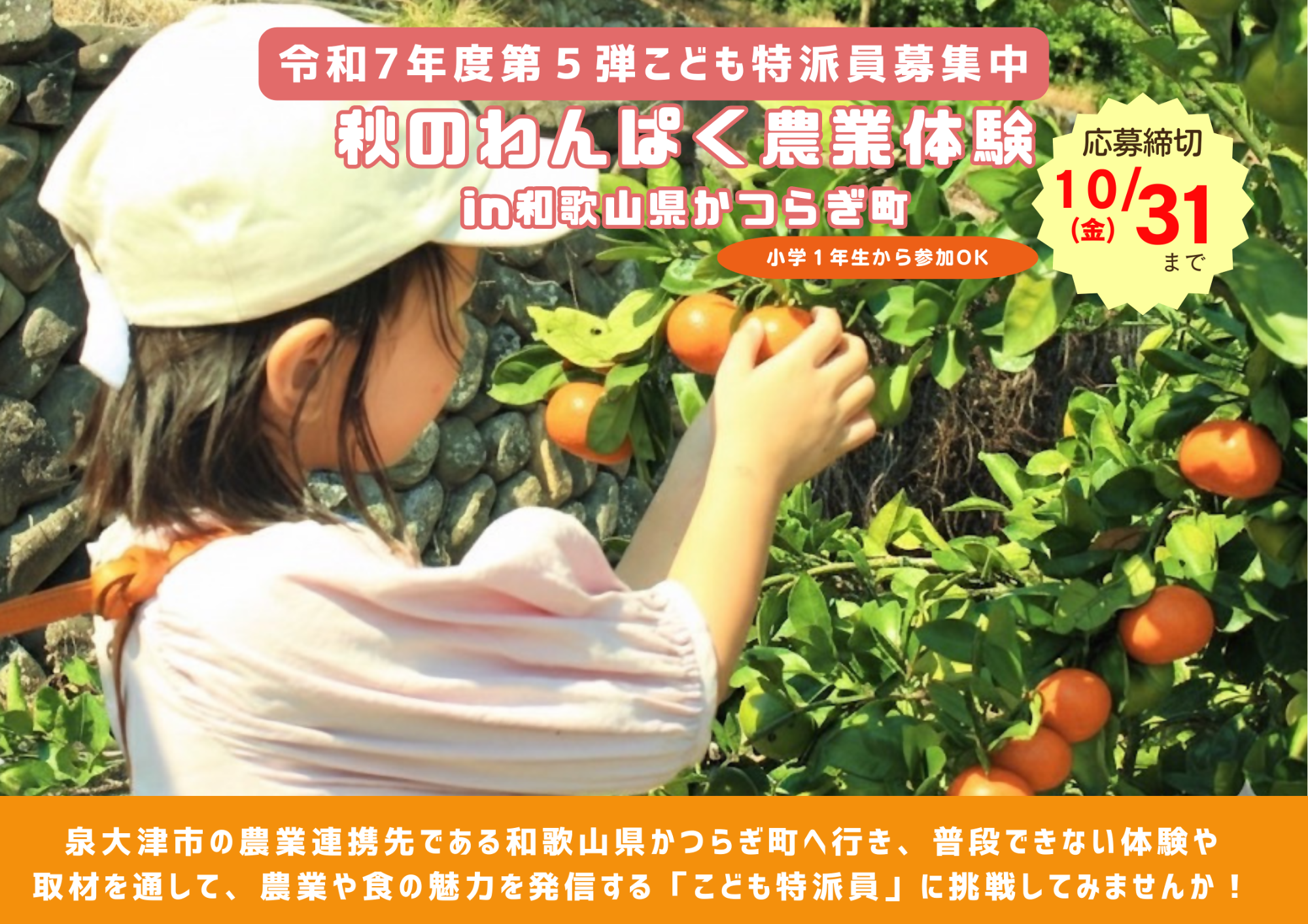 かつらぎ町ならではのみかん狩りや木工体験など、普段できない農業体験や生産者への取材と通して、「農業」や「食」の魅力を発信する「こども特派員」に親子で参加しませんか?