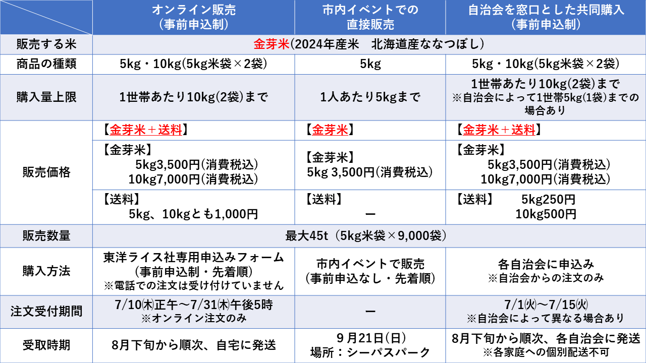 本市では、現在我が国において大きな社会問題となっている米の価格が高騰している状況を非常事態とみなし、市民生活の安定を図る公共的目的で、本市と包括連携協定を締結している東洋ライス株式会社が販売元となり、金芽米の特別販売を実施します。