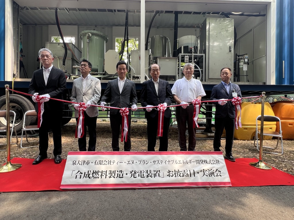 市は有限会社ティー・エヌ・プランと連携し、サステイナブルエネルギー開発株式会社の協力のもと、新たなエネルギー確保の手段として「合成燃料製造装置」により生成した合成燃料を活用した実証実験をスタートしました!
