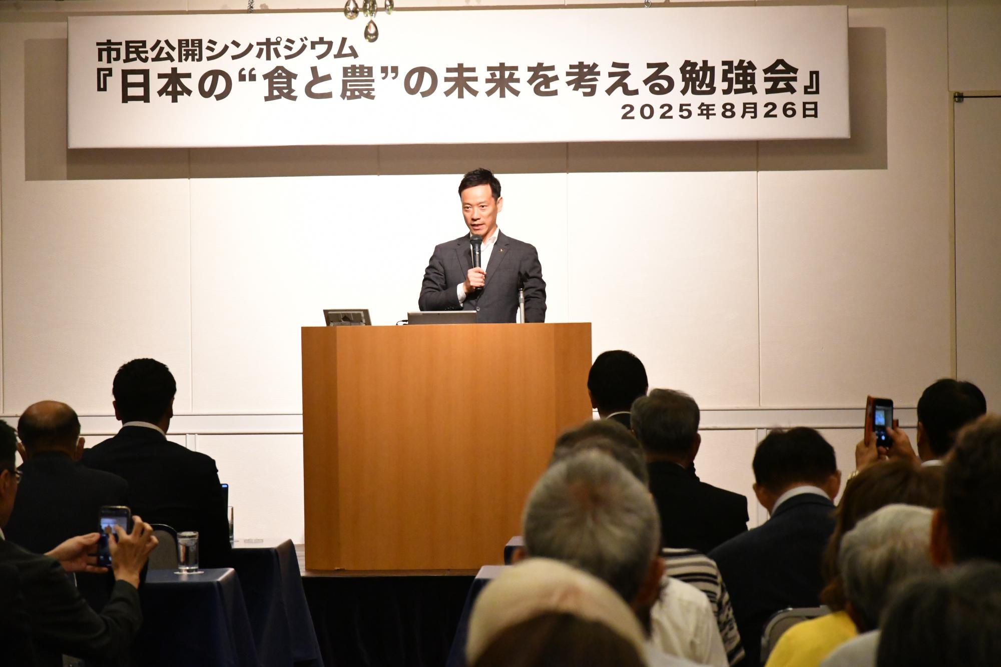 令和7年8月26日に、市民公開シンポジウム『日本の“食と農”の未来を考える勉強会』をハイブリッド形式で開催し、会場とオンラインあわせて約250名が参加しました。
