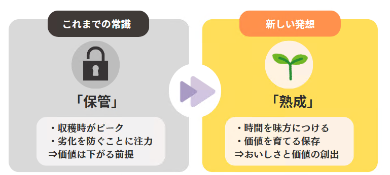 これまで米は「備蓄し、保管するもの」と考えられてきましたが、本プロジェクトでは「熟成」という新たな発想から、「時間が経つと品質が低下する」という“古米の概念”に着目し、時間の経過を価値へと転換することで、生産・流通・備蓄のあり方を見直します。