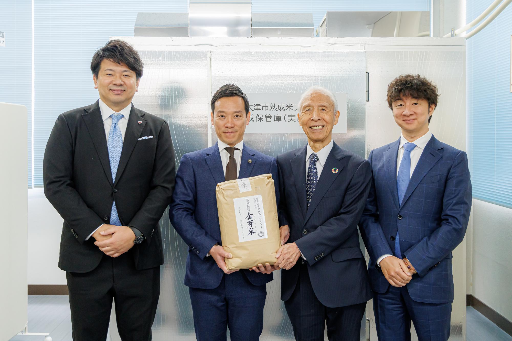 また、報道発表会では、日頃より本市と連携いただいている企業の代表者にも「立会人」としてご参加いただき、熟成米の保管工程をご確認いただきました。今回、立会人に同席いただいた理由としては、保管の工程を第三者の立場からご確認いただくことで、保管状況の透明性と信頼性を確保し、将来必要が生じた際にその状況を証明いただくためです。