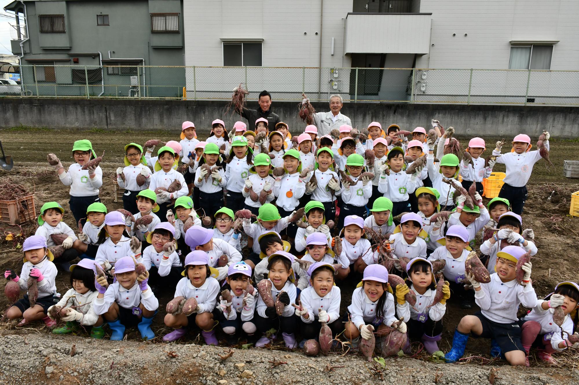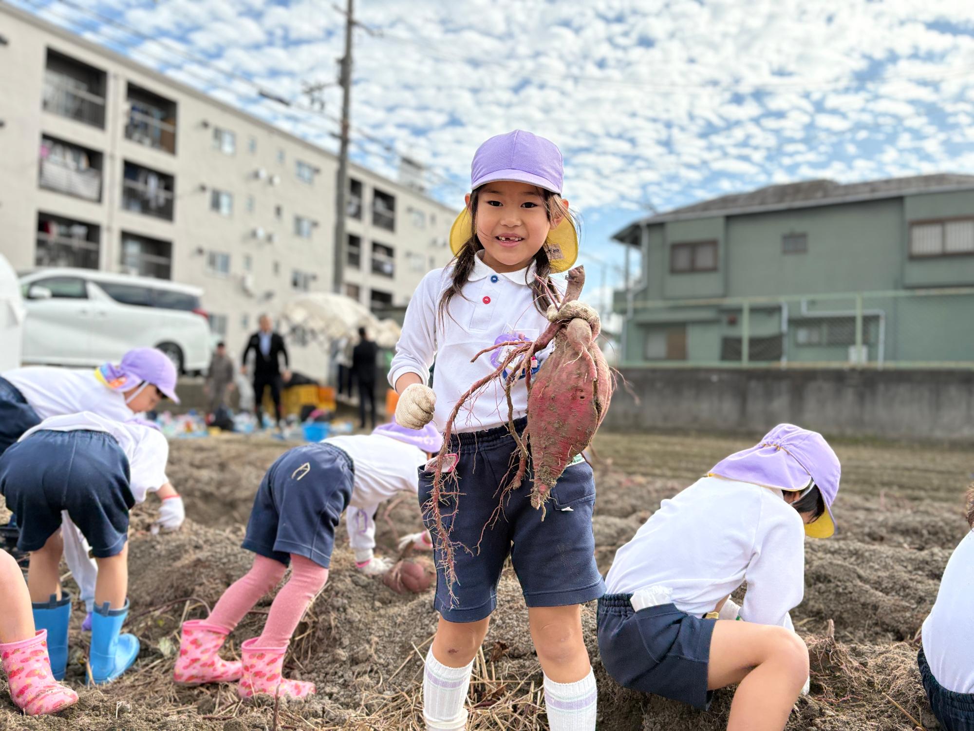 参加した園児の半数以上が「初めての体験」であり、力いっぱいつるを引っ張って、顔より大きな芋を収穫して歓声を上げていました。