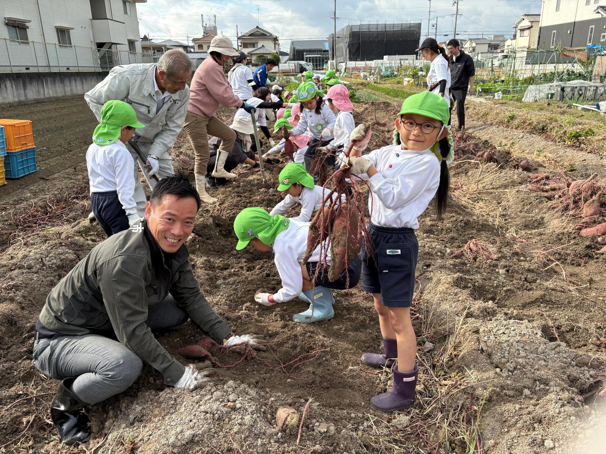 収穫体験は11月18日と19日の2日間にわたり実施し、延べ約90名の園児が参加しました。初日は南出市長とJAいずみの・谷口組合長も農園を訪れ、一緒にサツマイモの収穫を楽しみました。
