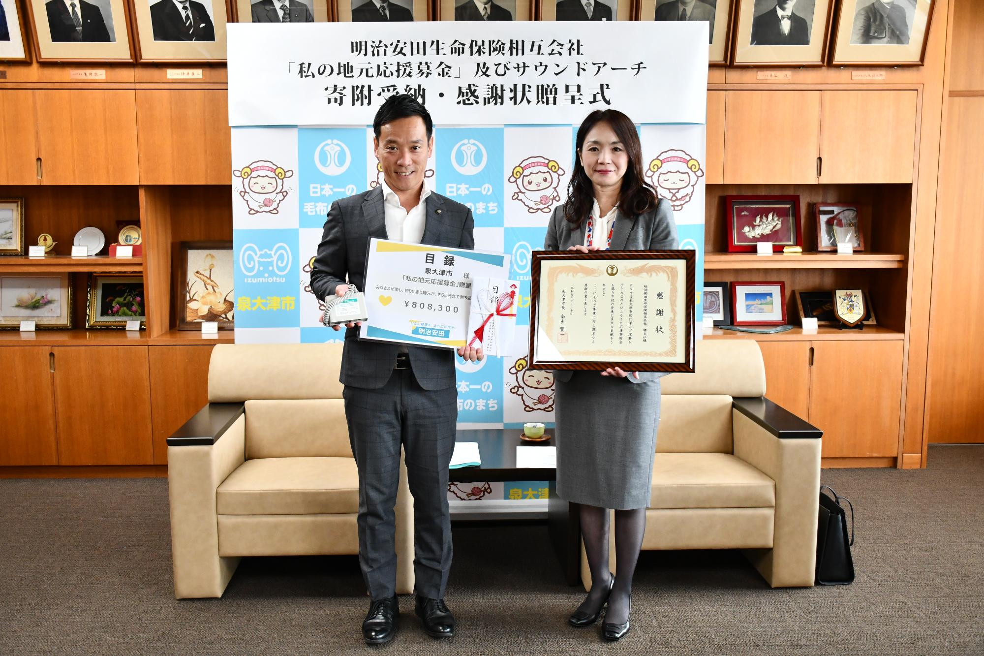 今回のご寄附は、同社の「地元の元気プロジェクト」の一環である「私の地元応援募金」として、本市にゆかりのある明治安田生命グループ従業員の皆様の募金を基に拠出されたものです。