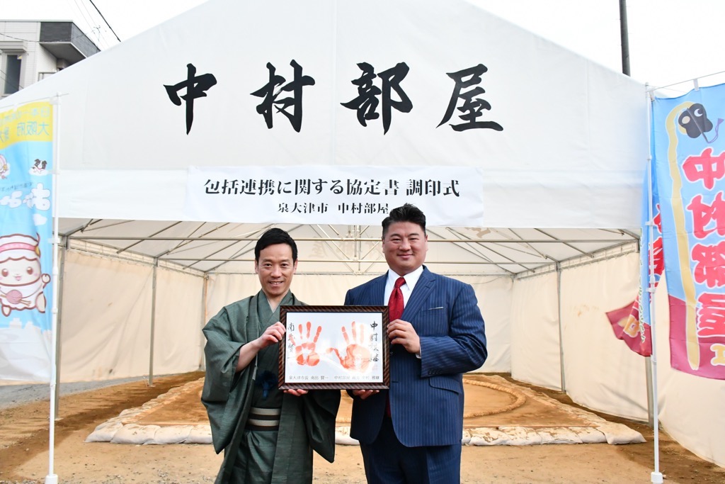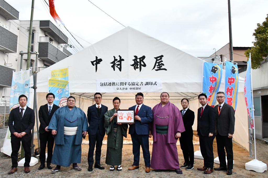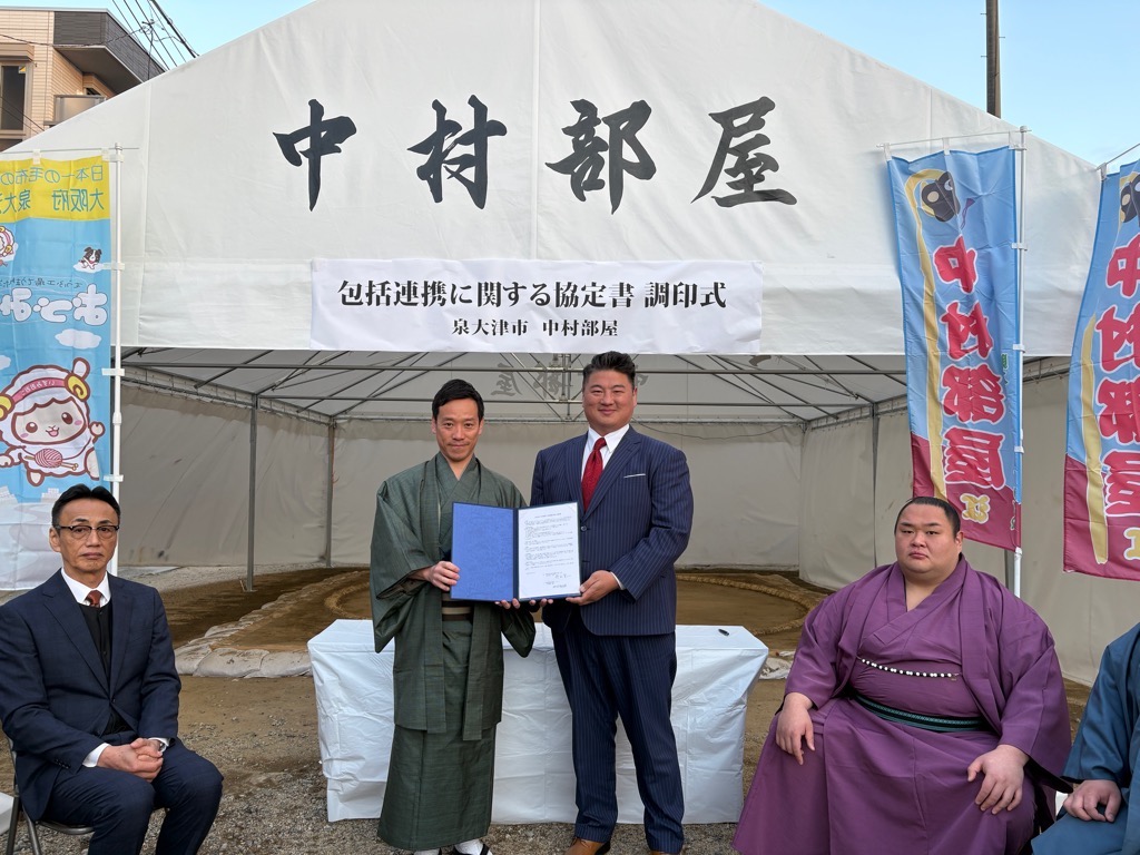 中村部屋は、令和8年大相撲三月場所(大阪場所)の活動拠点として、助松町内に拠点を構えました。これを契機として、相撲を通じた地域貢献の方向性が泉大津市と合致したことから包括連携協定の締結に至りました。
